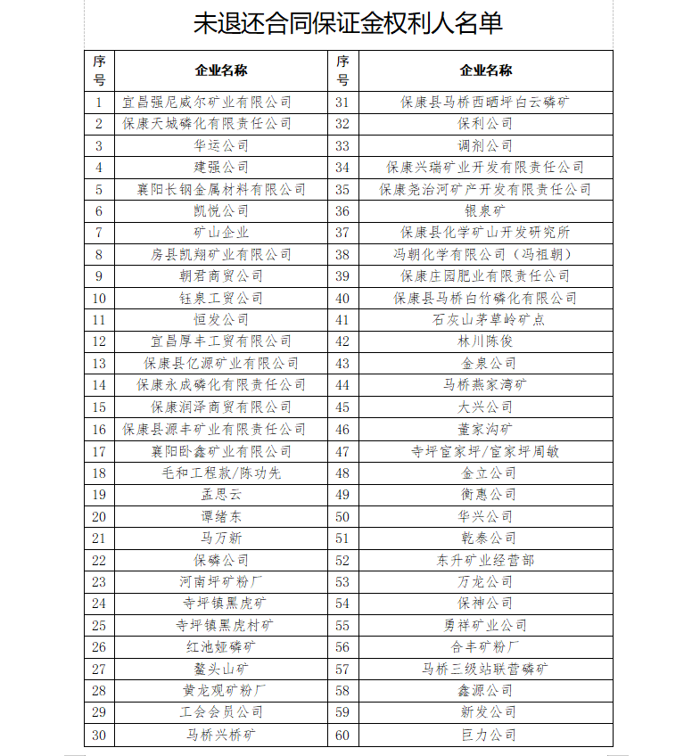 为积极清退磷矿产品经营权合同保证金(以下简称磷矿合同保证金),原保康县矿产资源管理办公室和县重点产业服务中心一直在积极办理清退手续,已多次通过电话、致函、发通知等方式催促清退。截至目前仍有部分企业或个人(以下统称合同权利人)无法取得联系,致使未清退。