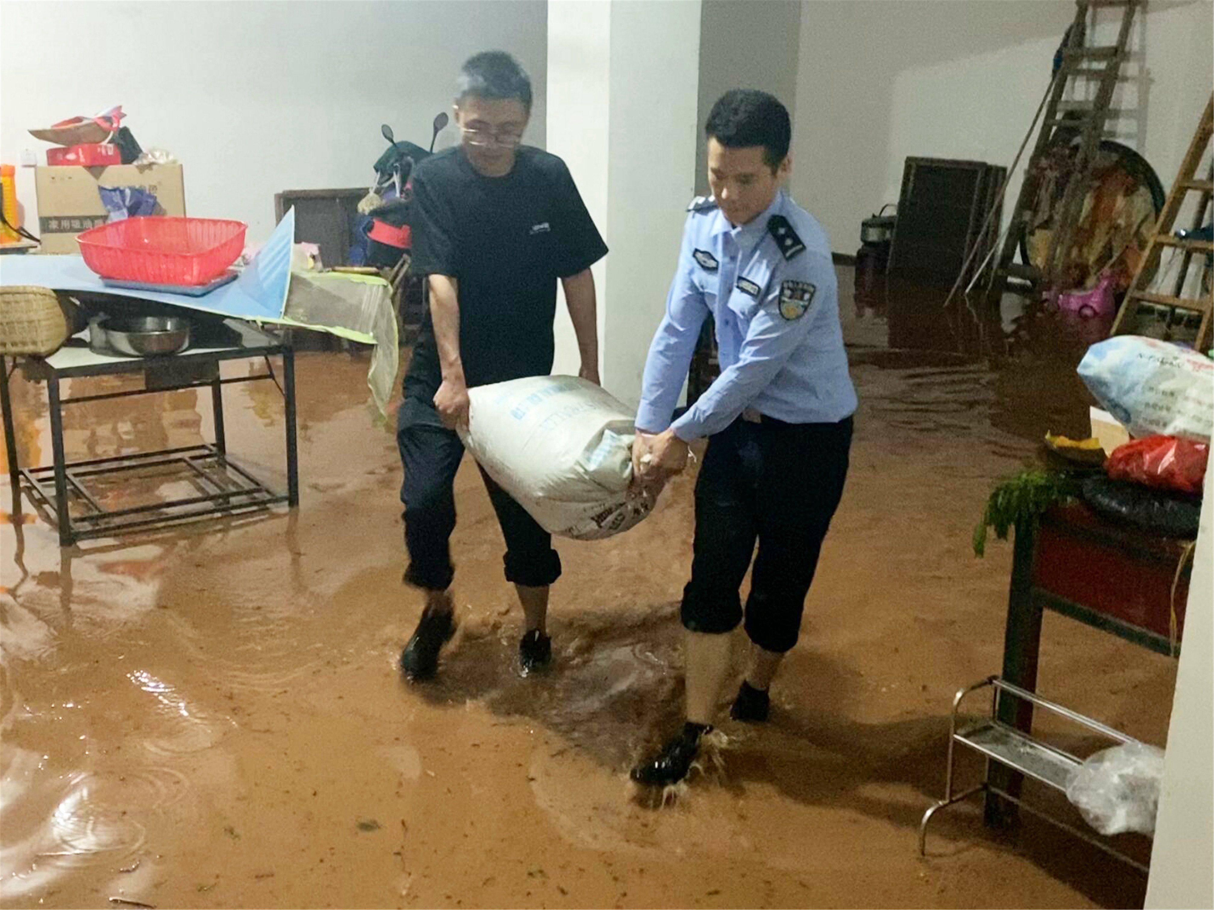 “快,我们先搬粮食!”肩扛、怀抱、手抬,两名警员争分夺秒,仅用时15分钟,就将一楼3000斤玉米和1000斤油菜籽搬至楼梯拐角处。“冰箱被水泡了,快搬!”紧接着,民警又将电器、家具等物件搬移到安全区域。
