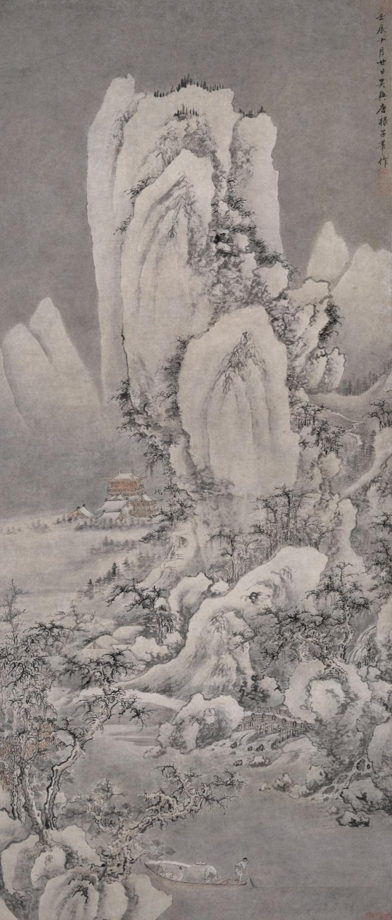 《雪港捕鱼图》绘群山披素、寒江凝碧、云天苍茫的严冬雪景。全图以浓淡参差、清透明净的水墨为主,其间点缀一座朱楼、一树红叶和一炉炭火,为这个俗世之外的冰雪乾坤、琉璃世界增添一抹明丽温馨的色彩。此图真伪存有争议,但作为一幅描绘冰天雪地的佳作,其雪江捕鱼的主题、水晕墨章的出色技艺,以及粉妆玉砌的世外景致,都映衬出如唐棣般的文人高士清雅出尘的冰雪襟怀。