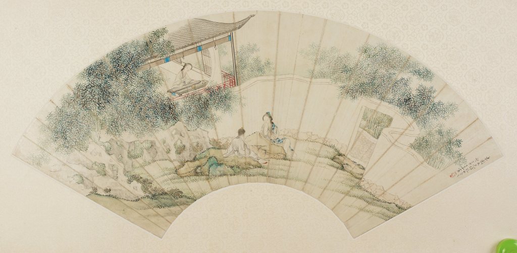 江苏省美术馆藏中国画《竹石人物图》描绘了私家园林中悠闲宁静的生活。画作中,拥有柳叶弯眉、樱桃口的女子坐在凉亭内轻抚琴弦,另两位人物坐在庭院内的山石上,似乎在闲聊什么。画中人物的衣纹造型准确,线条流畅;发丝细密,层次分明。周边山石及竹林的墨色变化颇为丰富,轮廓顿挫自然,有节奏感,增加了画面的韵味。