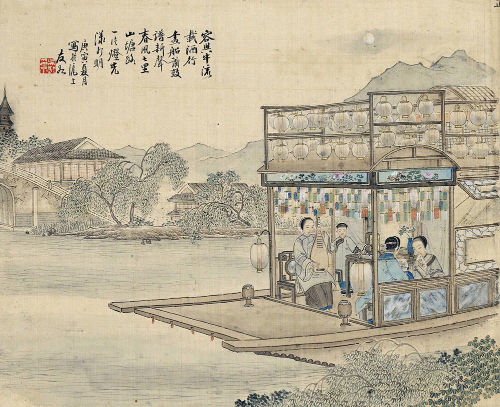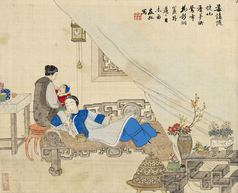 《仕女图》是以新闻画作闻名的晚清画家吴嘉猷描绘闺阁闲情的一套册页。册中春时女子对花展卷,诗书自娱;夏日美人轻纱薄衫,对镜簪花;秋夜闺秀窗下抚琴,登楼观月……十二开册页,无不构图别致,细节生动。此册是吴嘉猷五十岁左右改弦更张、亲近传统的代表作,不仅带有鲜明的时代色彩,也体现了当时部分画家对传统笔墨与西方绘画的态度。