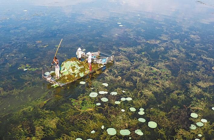 工人在洪湖水域开展常态化巡护与清理作业,为水生植物生长创造适宜环境。