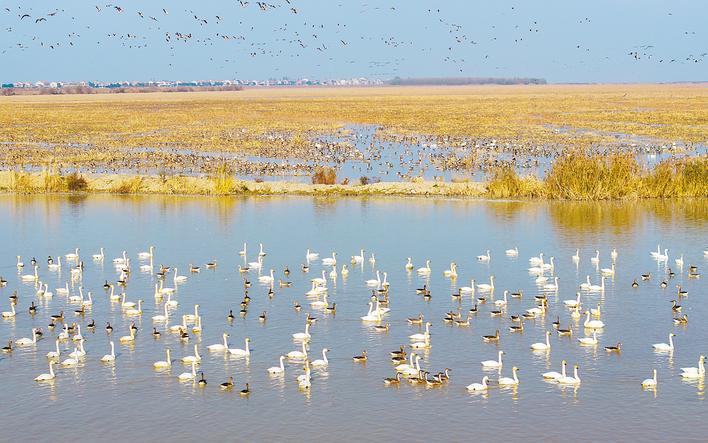 洪湖湿地保护区内,成群候鸟或觅食休憩,或展翅飞翔,构成一幅灵动的生态画卷。