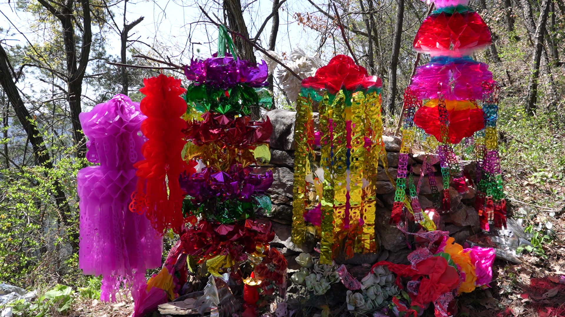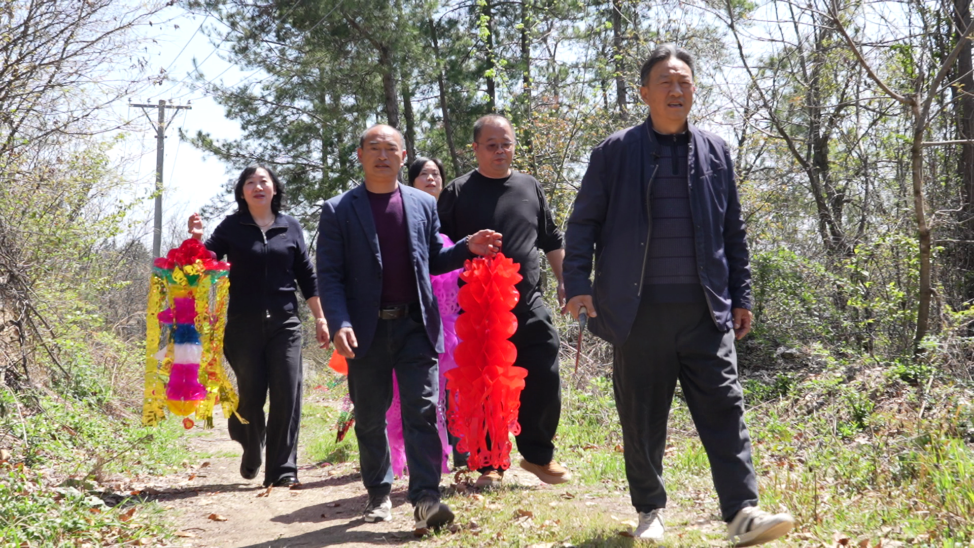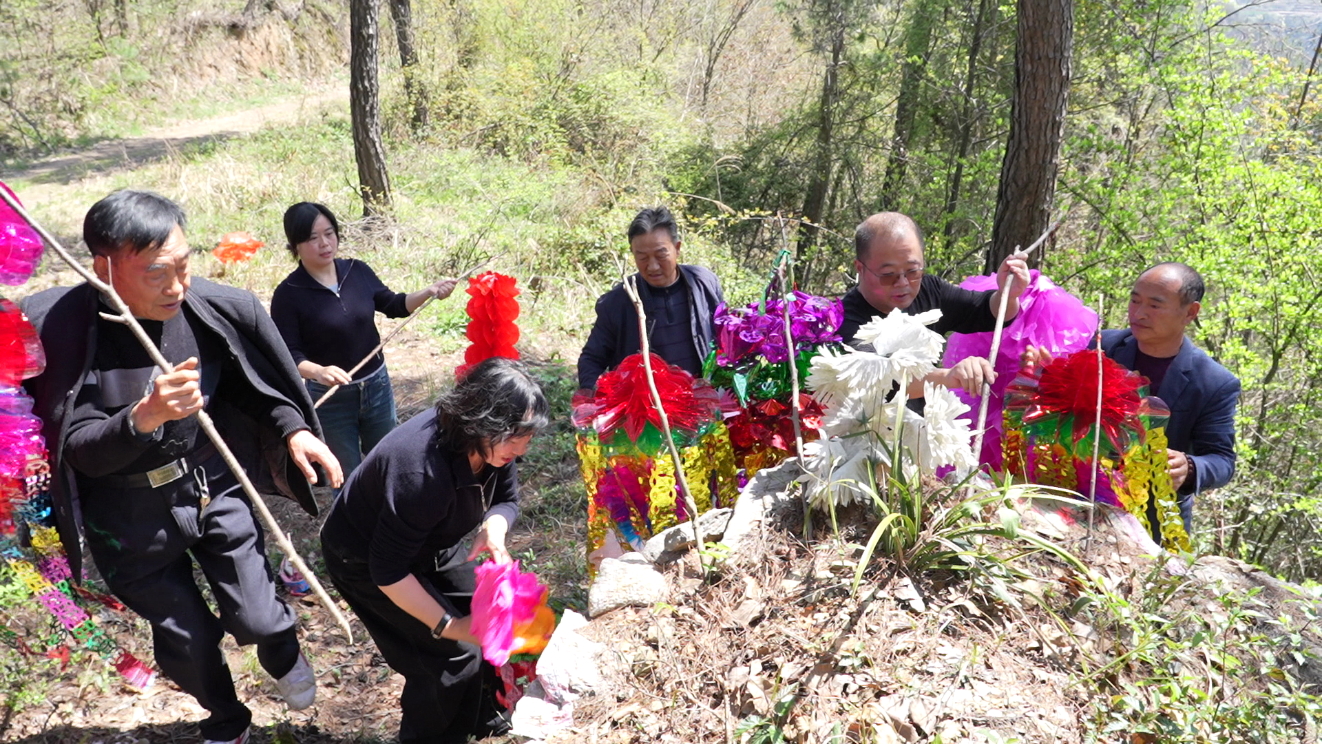 邓发成和大家一起动手清理墓边的枯枝杂草,细心整理好纸幡,并轻轻插入墓边泥土。做好这一切,他们对着红军墓深深三鞠躬。红军墓上的彩色纸幡随风飘扬,似乎在诉说着一个关于信念、感恩与传承的动人故事。