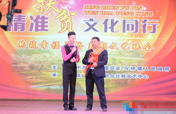 马桥镇党委书记宋涛致辞。文艺晚会在《我爱你中国》大型歌舞中拉开帷幕。紧接着,诗朗诵《扶贫礼赞》、舞蹈《盛世欢歌》、音乐快板《精准扶贫谱新篇》、小品《争星》、舞蹈《张灯结彩》、歌舞《坐上高铁去北京》、三句半《廉政清风》等轮番上演,晚会现场掌声、喝彩声此起彼伏,一浪盖过一浪……丰富多彩的文艺表演,让现场数千名观众享受了一场视觉盛宴。