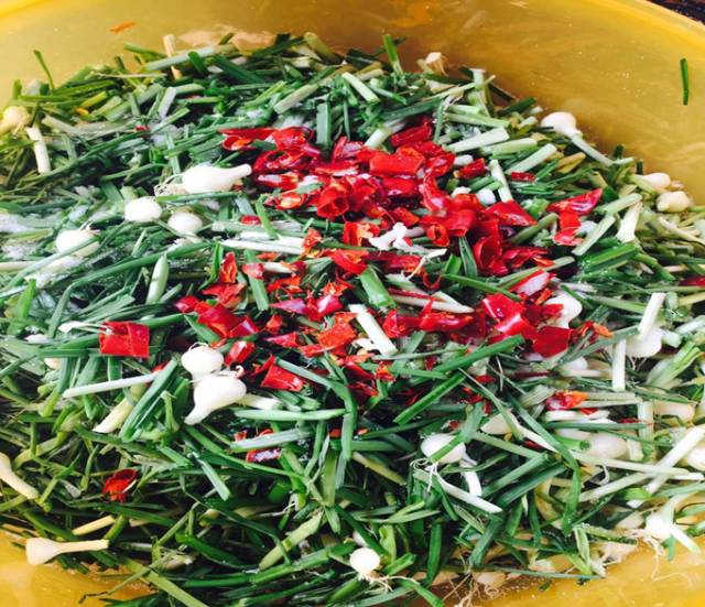 二荒地里的野韭菜还真不少,土地湿润,采摘也不需要什么工具,只是用手攥紧野韭菜的根部,轻轻一扯,大如小指头的白如珍珠般的野韭菜头连同根须上的泥土都被带出,然后就到山涧的溪水旁,一兜一兜的清洗,清清亮亮,回家晾干,或煎炒鸡蛋,或腌制发酵,做成酸菜,要不就直接细切,拌上辣椒面加香油,开水和匀,成为吃馒头和大米饭的下饭菜。
