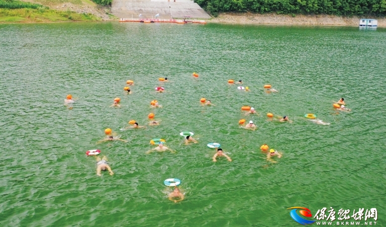 6月14日,保康县冬泳队队员在寺坪镇寺坪电站库区天子湖游泳。
