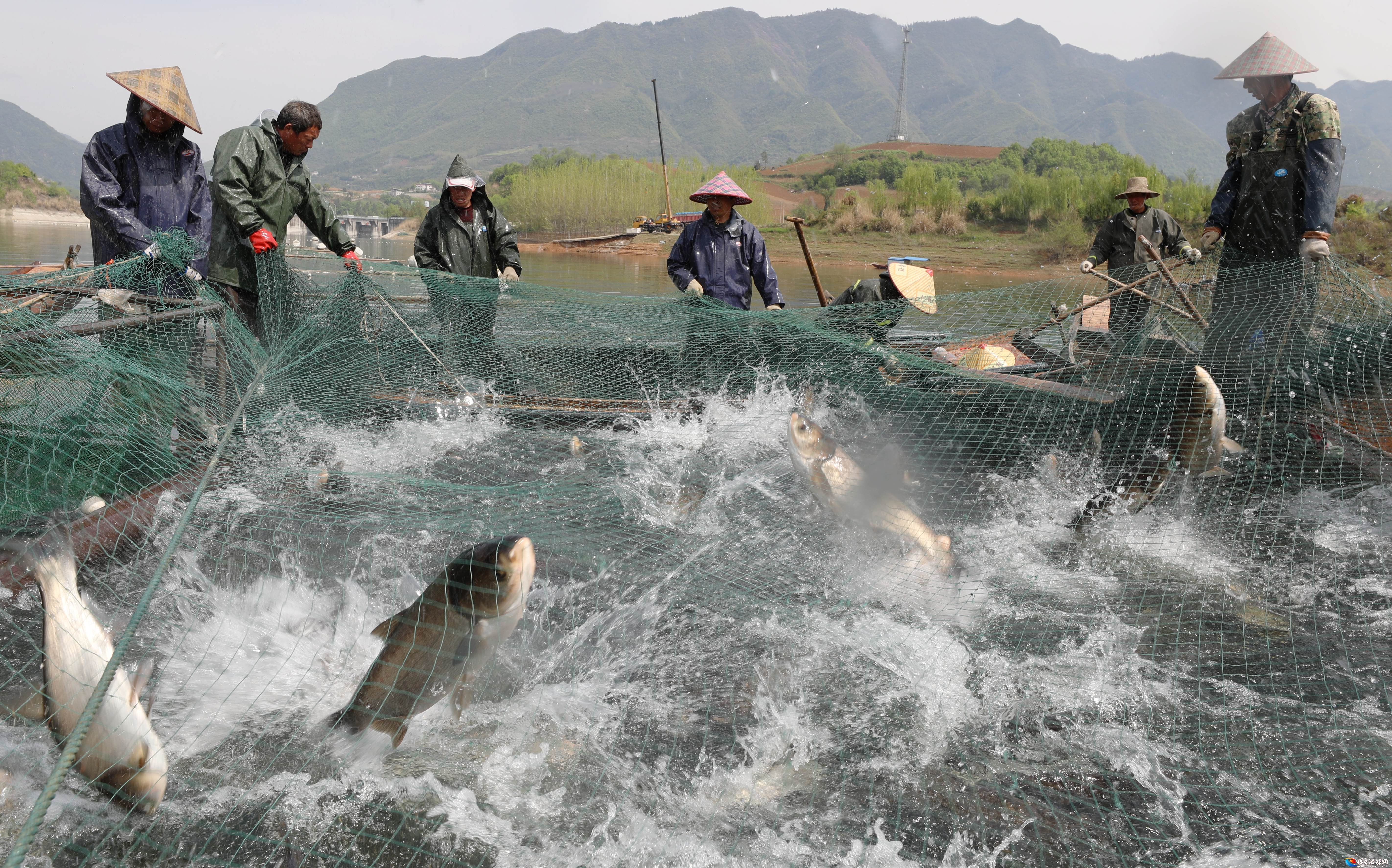 4月6日,保康县寺坪镇南河渔业农民专业合作社渔民在收网捕鱼。