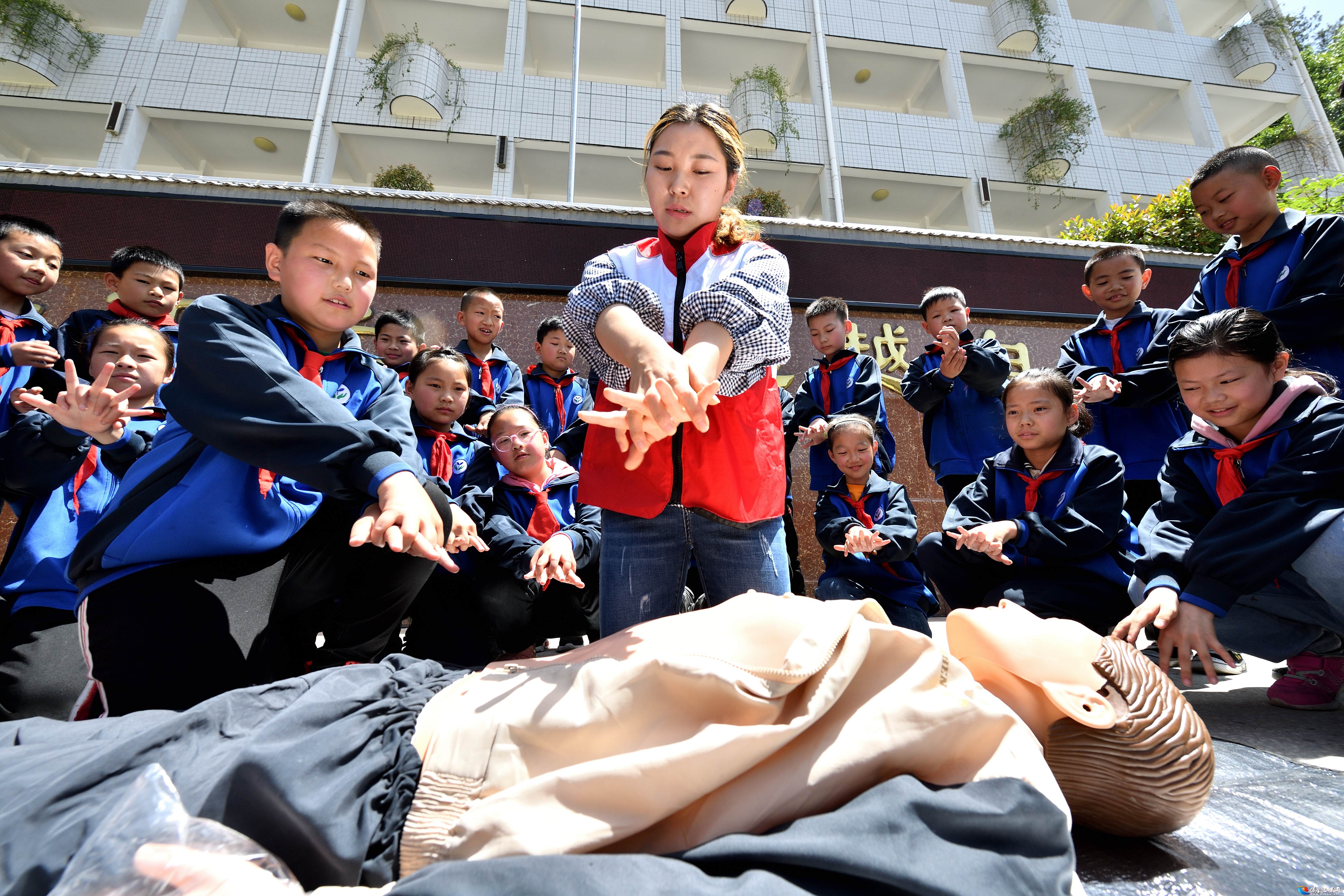 5月8日,在城关镇小学,县红十字会志愿者向学生讲解心肺复苏急救知识。