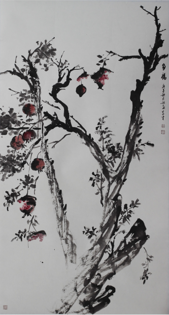我县画家刘训朝2020年10月于山东枣庄写生的此件石榴作品《多福》,高180厘米,宽96厘米,寓意“多子多福、笑口常开”。