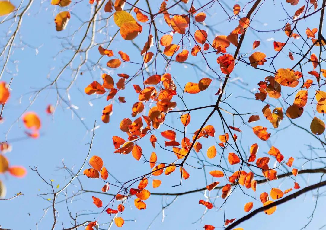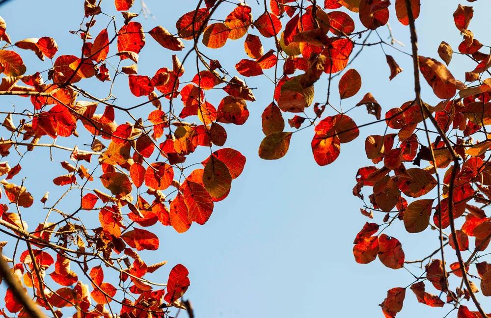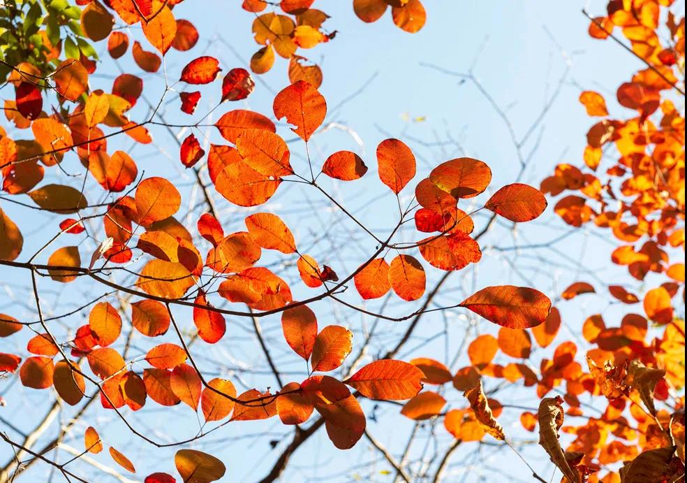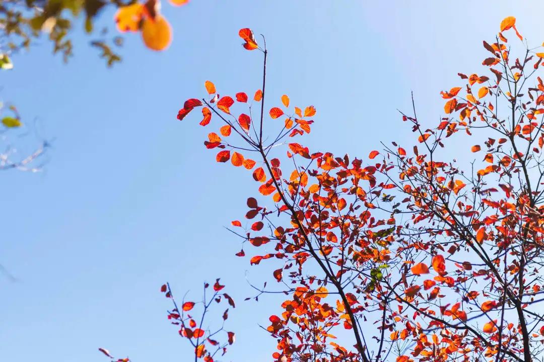 放眼望去,一簇簇鲜红、猩红、深红、紫红、橙红、橘红等五彩斑斓的红叶,在绿海中蔓延开来,在蓝天白云的映衬下显得格外娇艳绚烂,俨然一幅万山红遍、层林尽染的五彩画卷,构造成一个不见纤尘、自然纯净的“童话世界”。