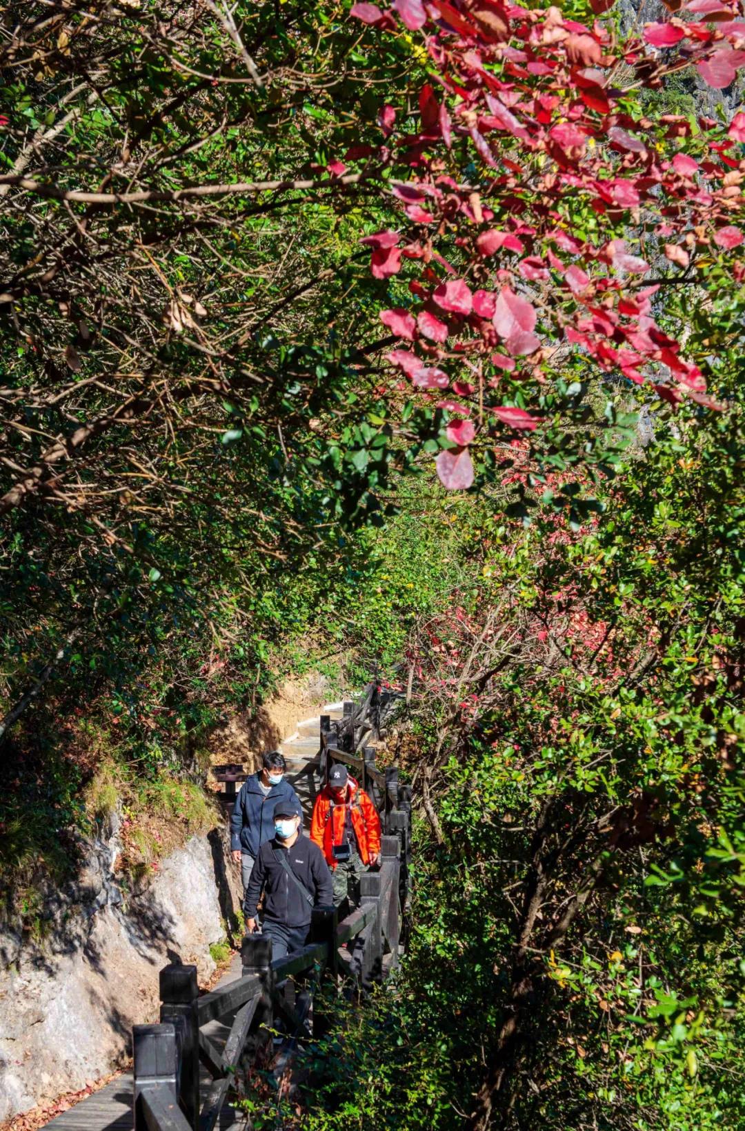 初冬时节,位于荆山深处的湖北省襄阳市保康县九路寨生态旅游区的红叶进入红叶最佳观赏期,吸引全国各地游客前来观赏。